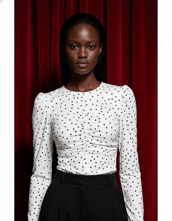 Блуза со сборкой по переду, прилегающего силуэта на подкладке. Модель имеет круглый вырез горловины и длинный втачной рукав. Сбоку застежка на потайную тесьму "молния". Изделие выпонено из вискозной ткани.