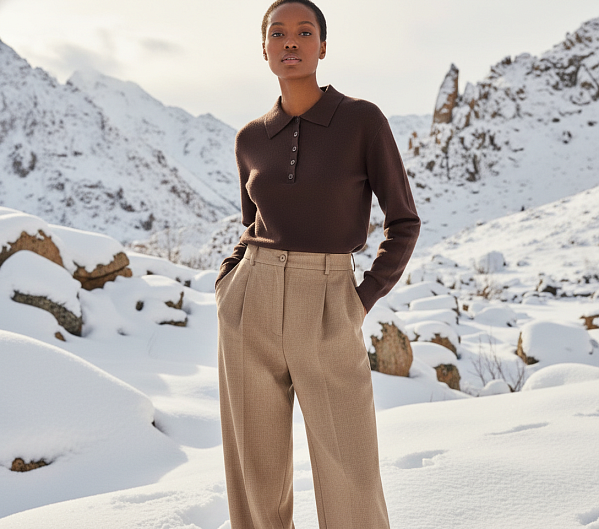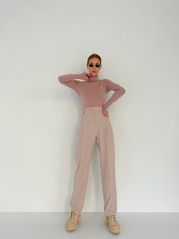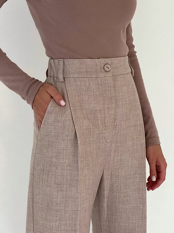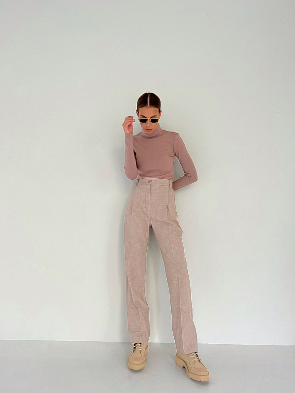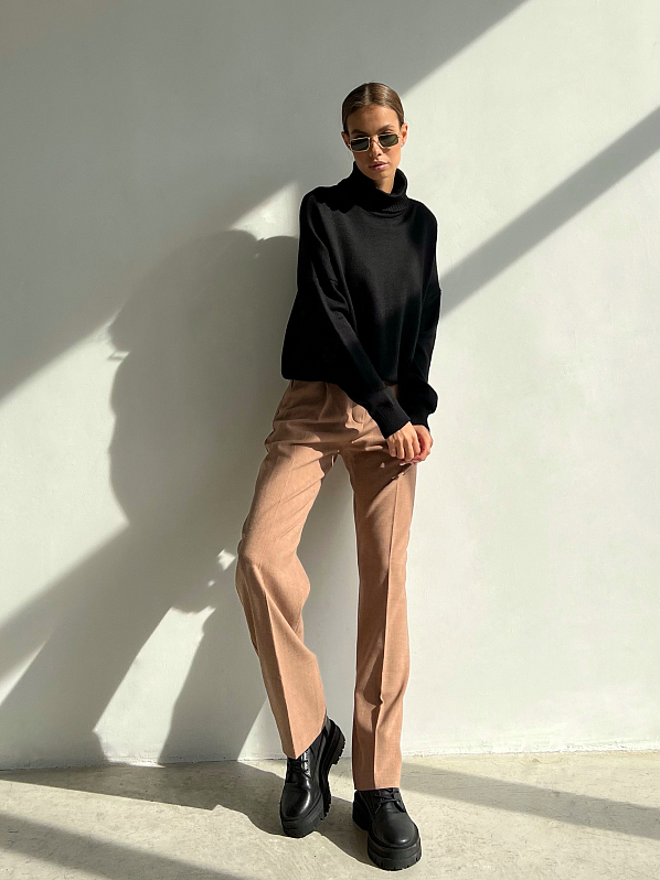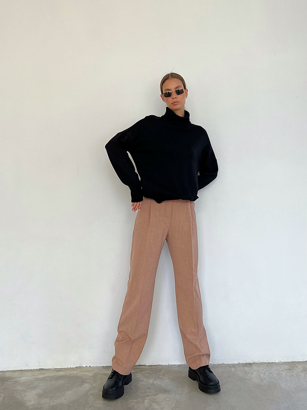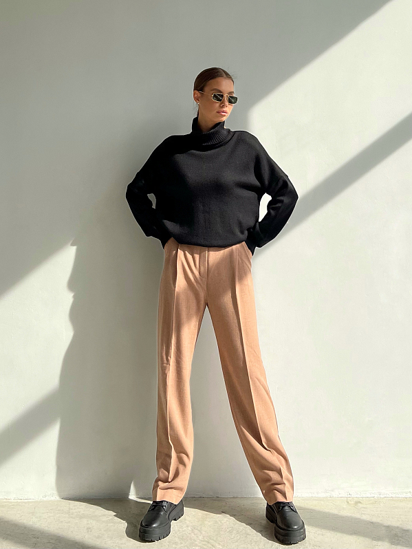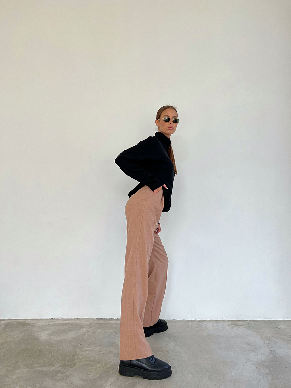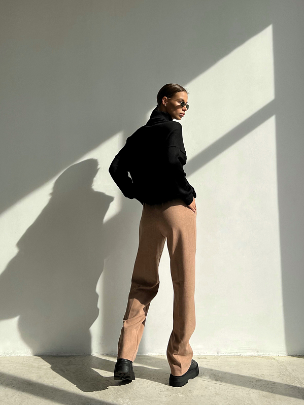 Брюки прямого силуэта со стрелками спереди. Пояс притачной со шлевками, сзади на резинке. Модель с боковыми карманами, спереди застёжка на тесьму "молния" и пуговицу. Изделие выполнено из костюмной ткани с содержанием шерсти, которая хорошо держит форму.т форму.