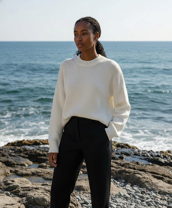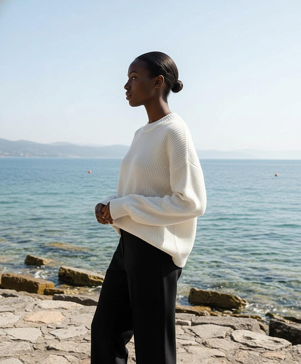 Джемпер прямого силуэта с круглым вырезом горловины. Модель со спущенной линией плеча имеет длинный втачной рукав, по бокам с разрезами. Изделие вязаное, выполнено из пряжи, в состав которой входит хлопок.