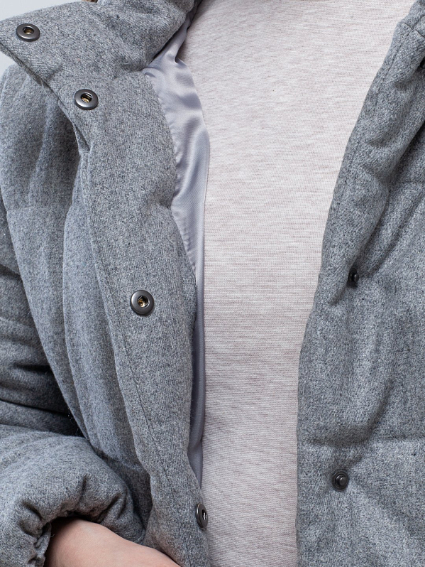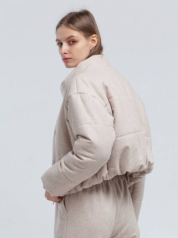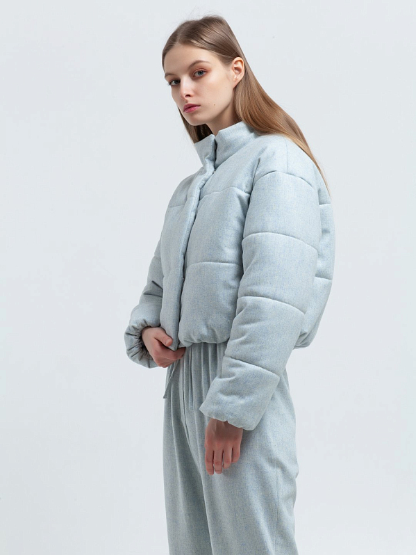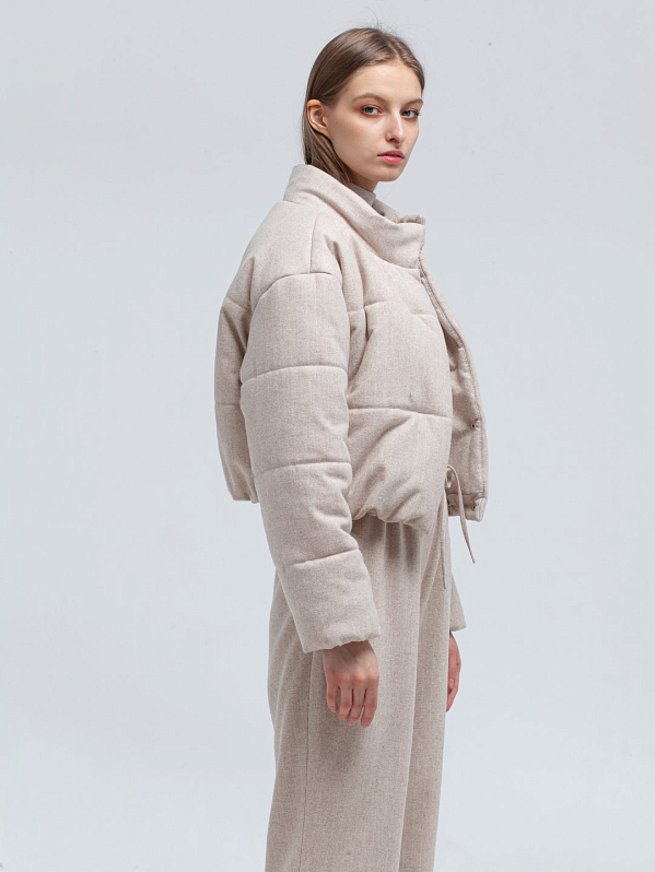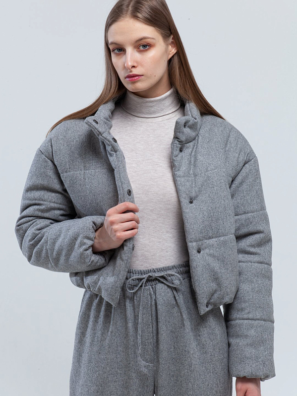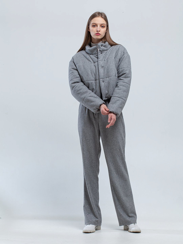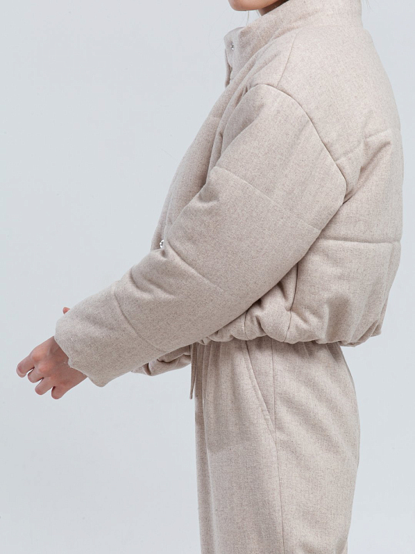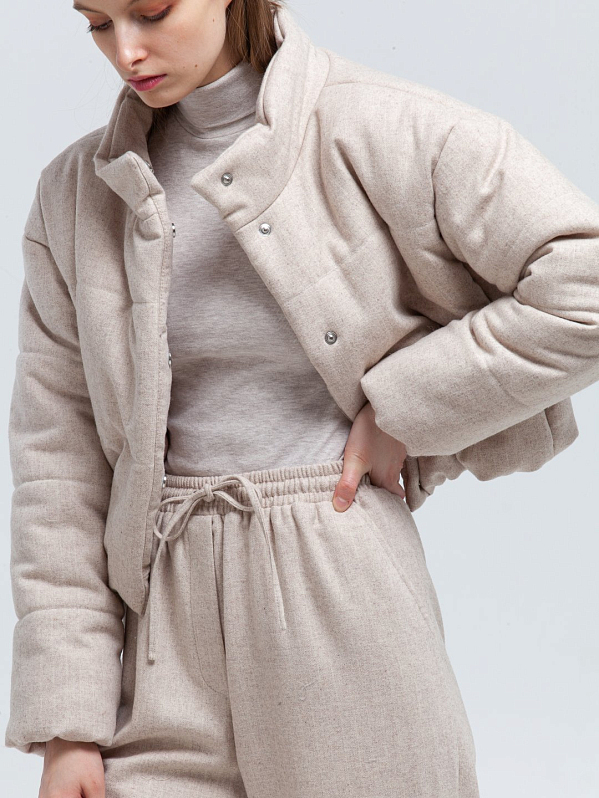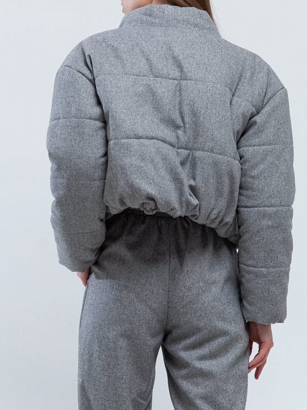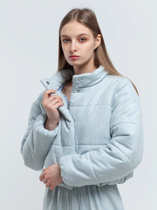Утепленная стеганая куртка с воротником-стойкой. Перед оформлен прорезными карманами в рельефах. Центральная застёжка на потайные кнопки. Модель со спущенной линией плеча имеет длинный втачной рукав. Низ рукава и низ изделия оформлен сборкой за счет эластичной резинки. Куртка выполнена из тонкой шерстяной ткани с ветрозащитным слоем на вискозной подкладке, внутри современный утеплитель «Холл-Софт», такое сочетание материалов способно обеспечить высокий уровень комфорта и сохранность тепла.