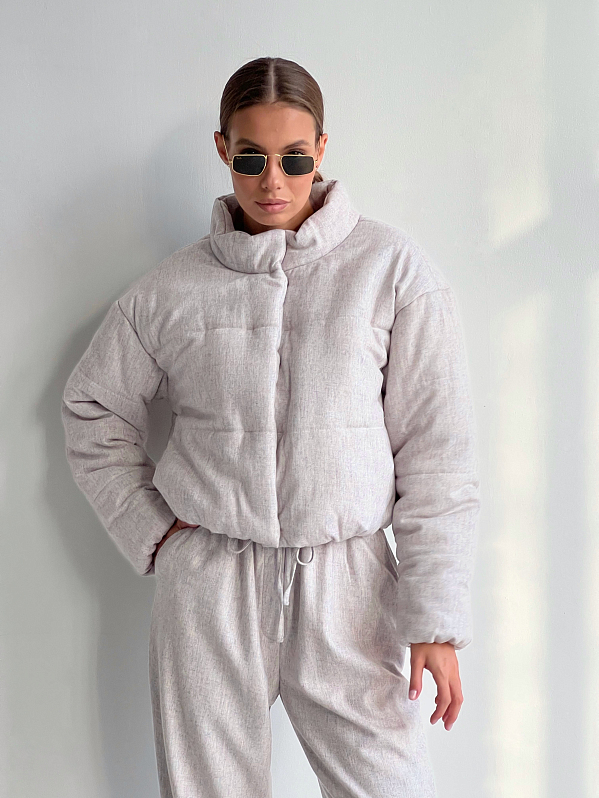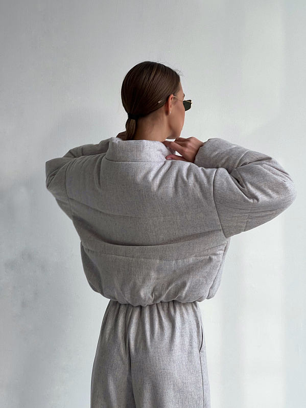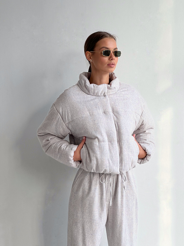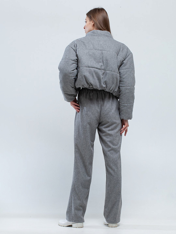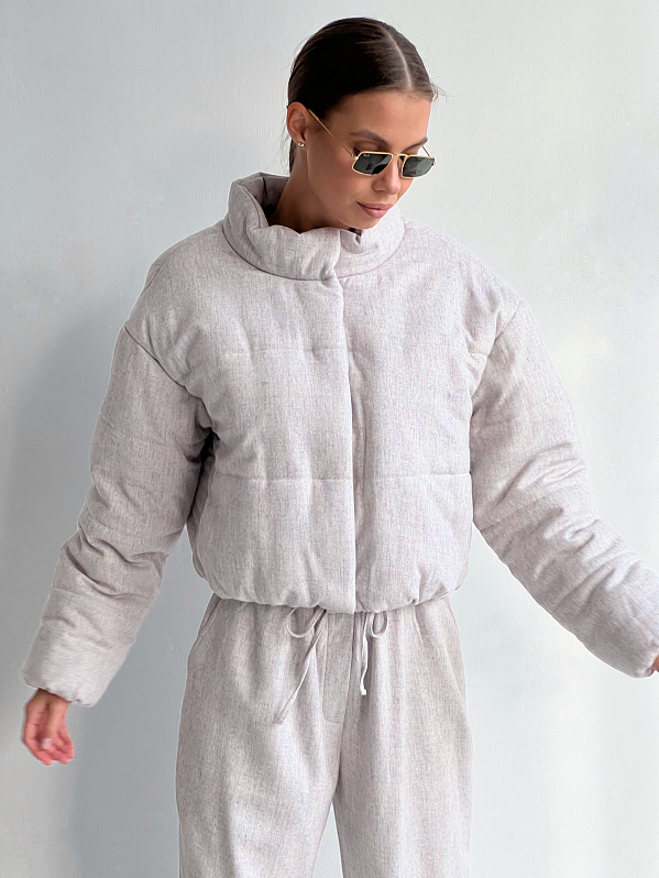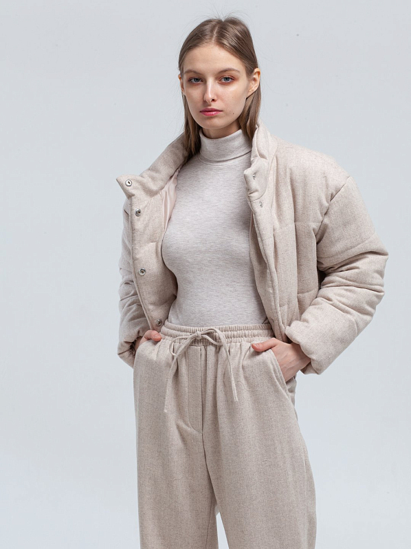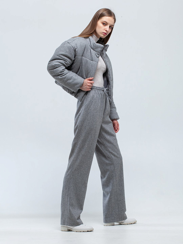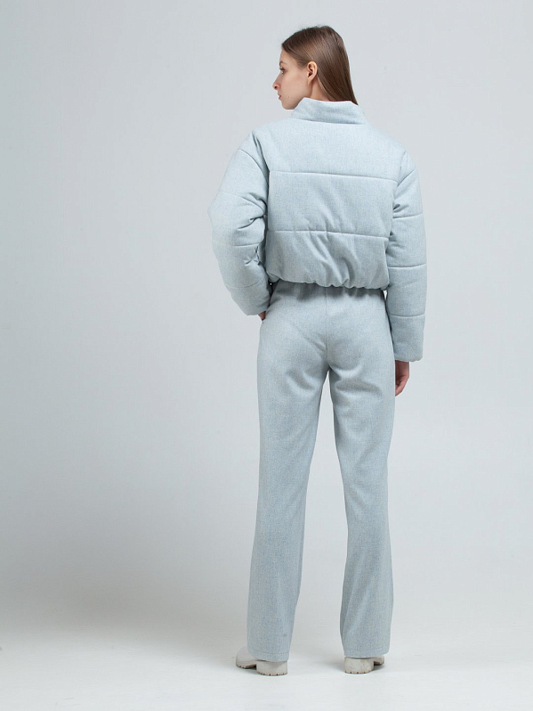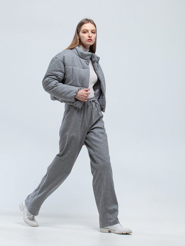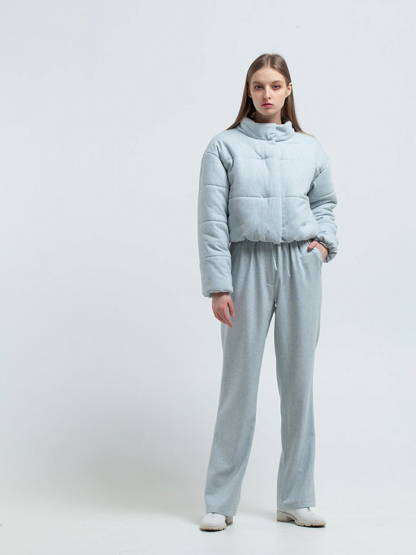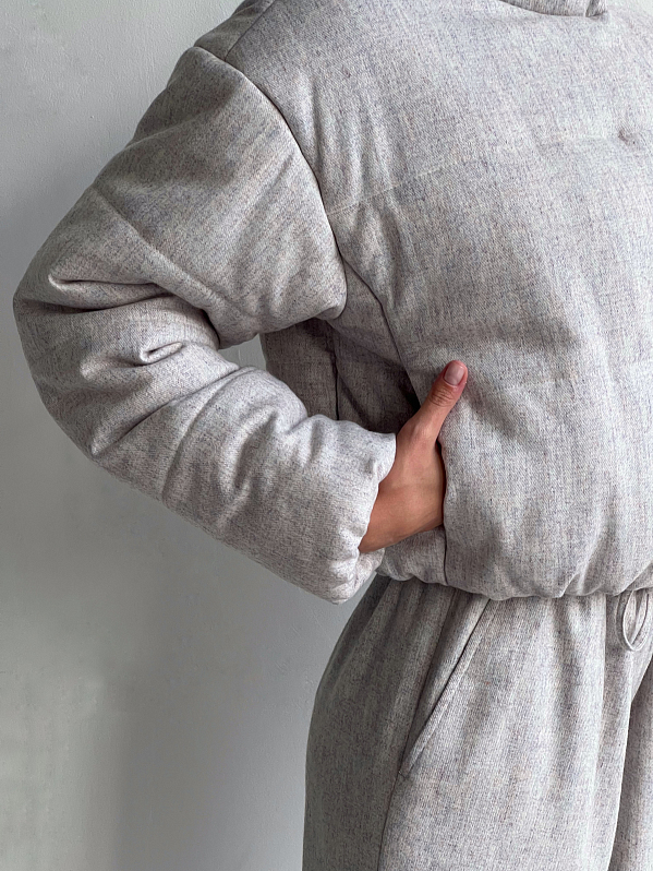 Утепленная стеганая куртка с воротником-стойкой. Перед оформлен прорезными карманами в рельефах. Центральная застёжка на потайные кнопки. Модель со спущенной линией плеча имеет длинный втачной рукав. Низ рукава и низ изделия оформлен сборкой за счет эластичной резинки. Куртка выполнена из тонкой шерстяной ткани с ветрозащитным слоем на вискозной подкладке, внутри современный утеплитель «Холл-Софт», такое сочетание материалов способно обеспечить высокий уровень комфорта и сохранность тепла.