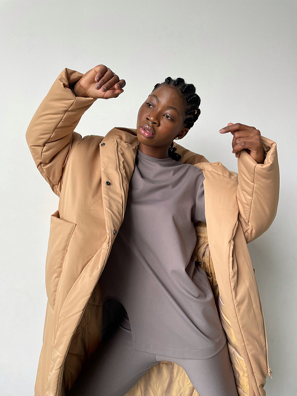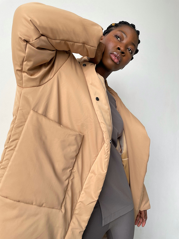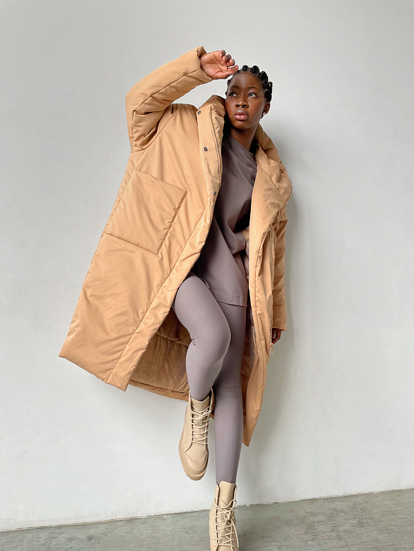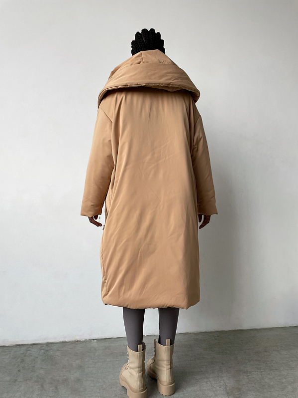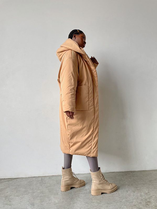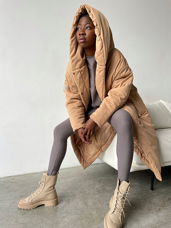 Пальто оверсайз на утеплителе. Модель с капюшоном и накладными карманами. Центральная застёжка на тесьму"молния" и потайные кнопки. Модель имеет длинный втачной рукав. Изделие выполнено из плащевки на вискозной подкладке, внутри современный утеплитель «Холл-Софт 300», такое сочетание материалов способно обеспечить высокий уровень комфорта и сохранность тепла.