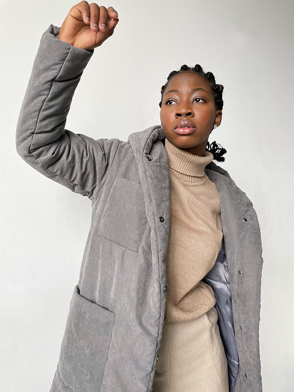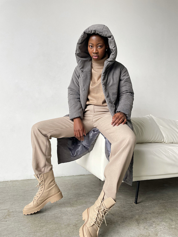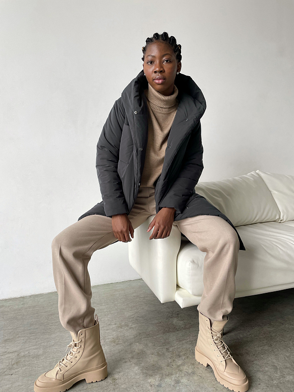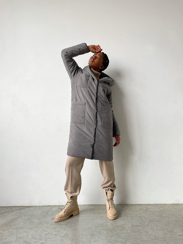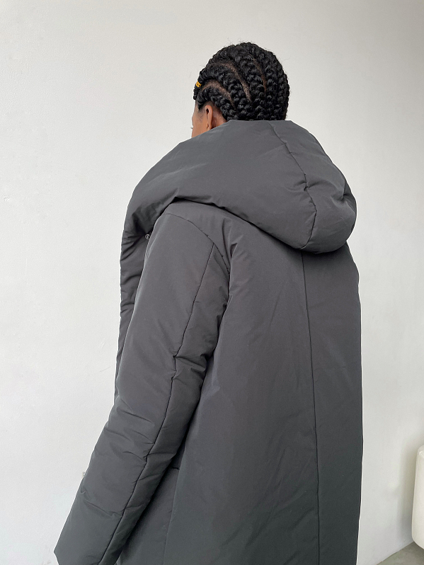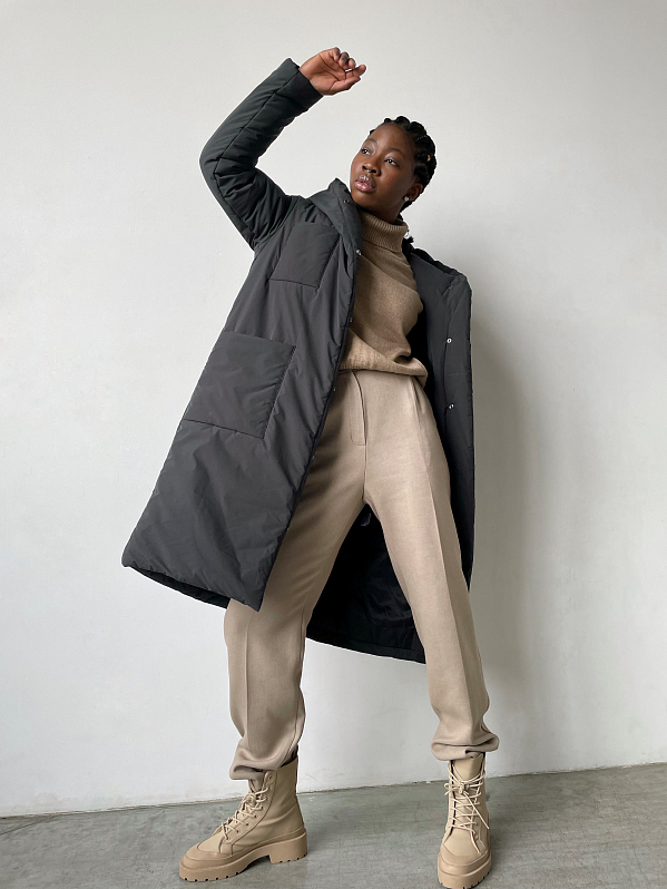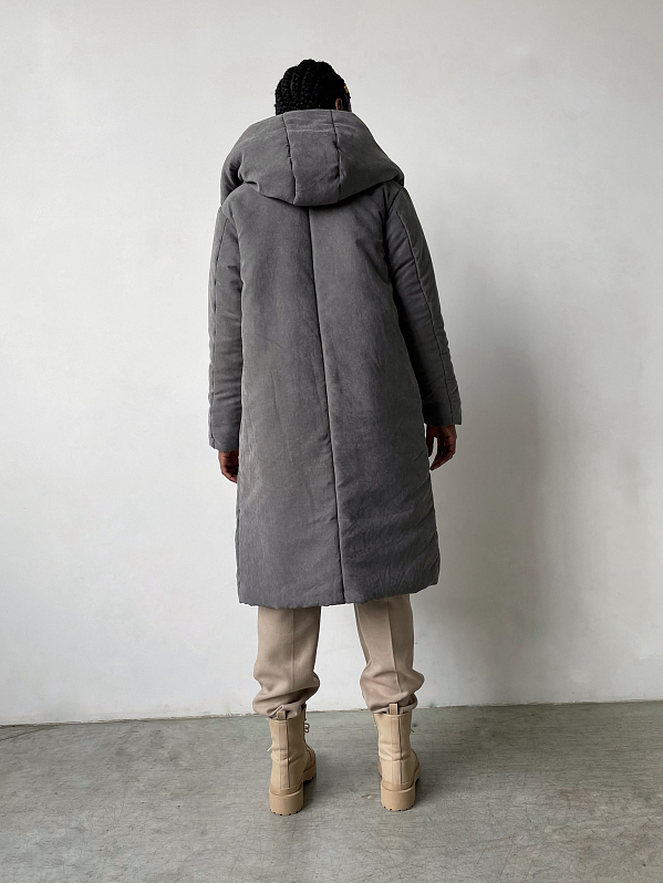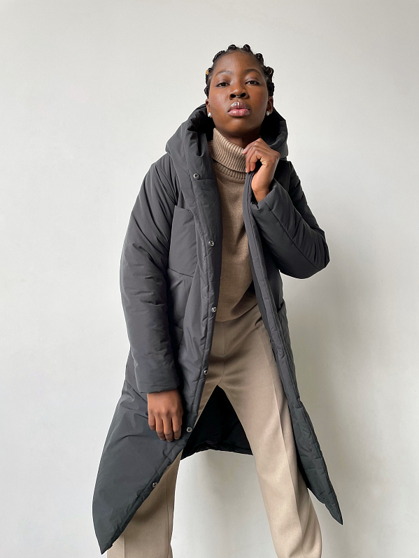 Пальто прямого силуэта на утеплителе. Модель с капюшоном и накладными карманами. Центральная застёжка на потайные кнопки. Модель имеет длинный втачной рукав. Изделие выполнено из плащевки на вискозной подкладке, внутри современный утеплитель «Холл-Софт 200» и шерстепон, такое сочетание материалов способно обеспечить высокий уровень комфорта и сохранность тепла.