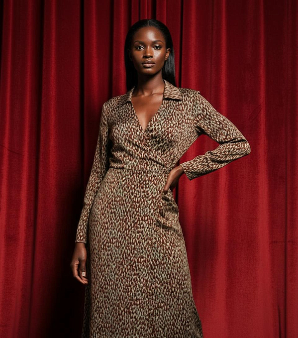 Платье миди полуприлегающего силуэта на подкладке с длинным втачным рукавом. Изделие на запах. Модель имеет карманы в боковых швах. В комплект входит съемный пояс. Линия талии отрезная, сзади на резинке. Изделие выполнено из плательной ткани верха и приятной к телу вискозной подкладочной ткани.