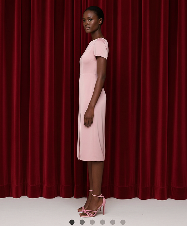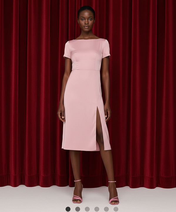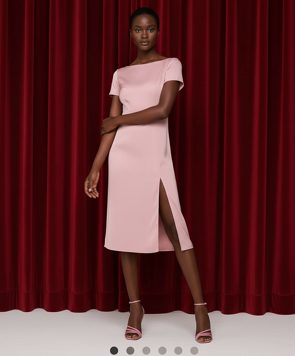 Платье миди полуприлегающего силуэта. Линия талии отрезная. Юбка переда с разрезом. Модель имеет круглый вырез горловины спереди и короткий втачной рукав. Спинка со сборкой за счет эластичной тесьмы "резинка". Изделие выполнено из плательной ткани. Материал легкий, создаёт струящийся силуэт.