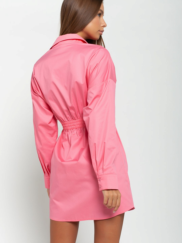 Платье-рубашка мини приталенного силуэта с отложным воротником на стойке. Центральная застежка на пуговицы. Модель имеет длинный втачной рукав со складками. Низ рукава оформлен притачной манжетой с застежкой на пуговицу. По талии перед платья оформлен защипами, по спинке приталивание за счет резинки. Изделие выполнено из хлопковой ткани, что обеспечивает максимальный комфорт и удобство при носке.