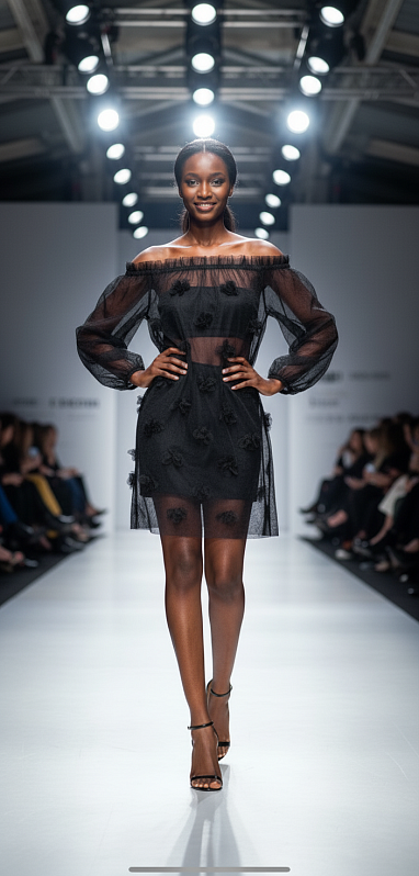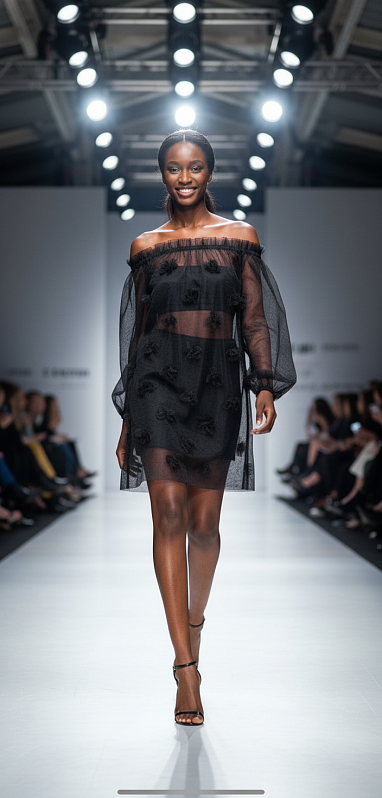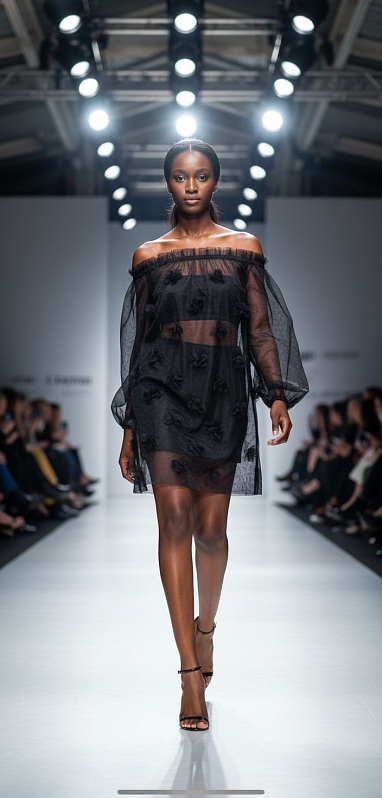 Платье мини с открытыми плечами свободного силуэта, с объемными декоративными цветами ручной работы. Модель имеет длинный рукав. Низ рукава со сборкой на резинке. Верх платья со сборкой на резинку.Изделие выполнено из фатина.