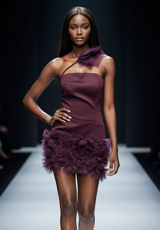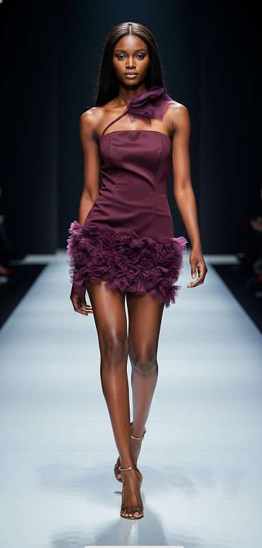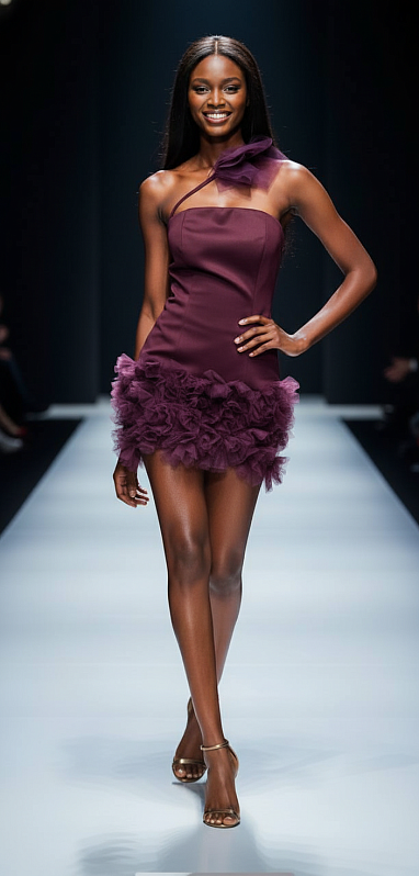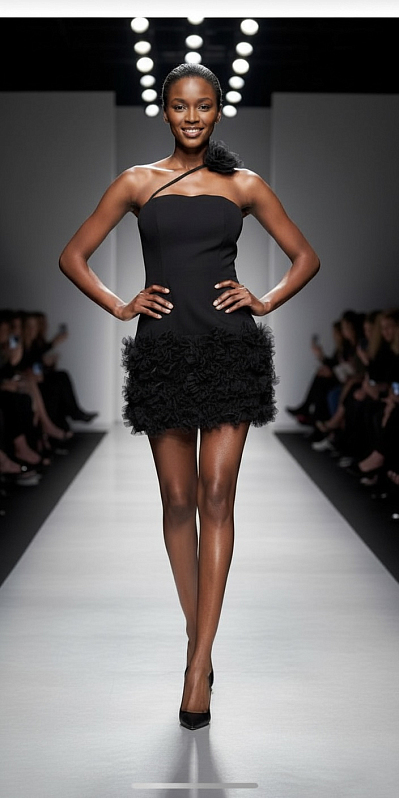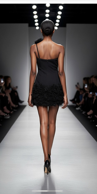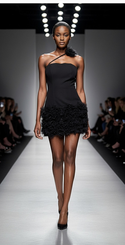 Платье мини с объемными декоративными цветами по низу, прилегающего силуэта. В комлект к платью входит чокер с цветком на веревке. Верх платья корсетного типа. Сзади застежка на тесьму "молния". Изделие выполнено из костюмной ткани верха и вискозной подкладочной ткани.