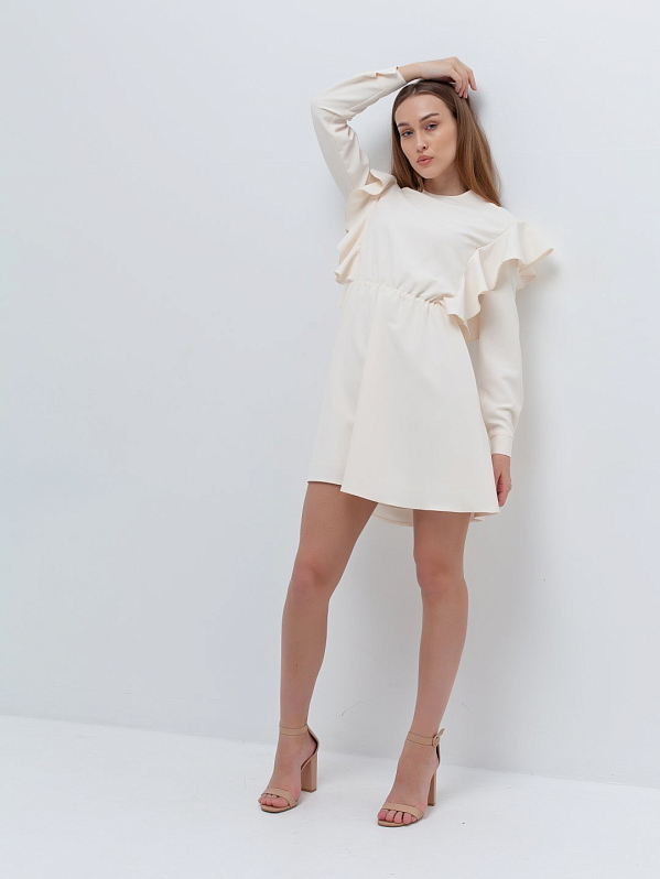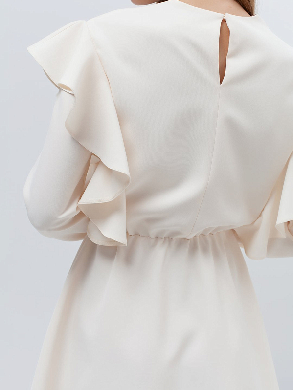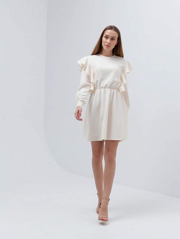 Платье мини полуприлегающего силуэта на подкладке. Линия талии отрезная, оформлена сборкой на резинку. Модель имеет круглый вырез горловины и длинный втачной рукав. Платье с крылышками. На спинке застежка на пуговицу. Изделие выполнено из плательной ткани верха и вискозной подкладочной ткани.