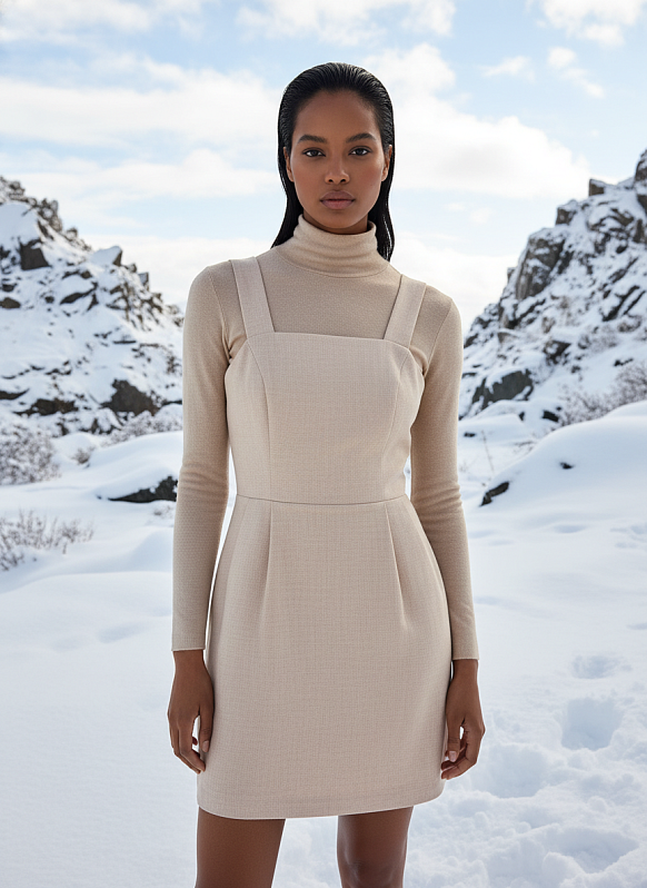 Сарафан мини прилегающего силуэта на широких бретелях. Линия талии отрезная, сзади на резинке. Спинка оформлена сборкой за счет эластичной тесьмы. Изделие выполнено из ткани верха с содержанием шерсти и вискозной подкладочной ткани, что обеспечивает комфорт и удобство при носке.