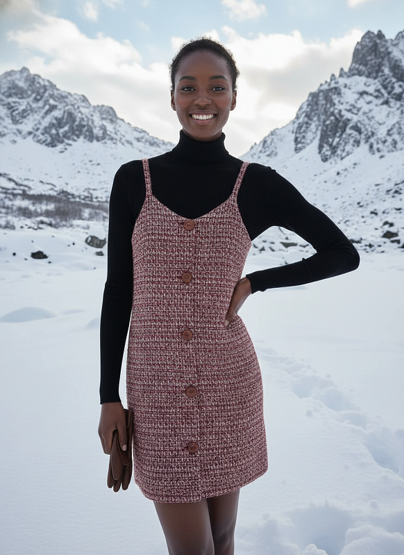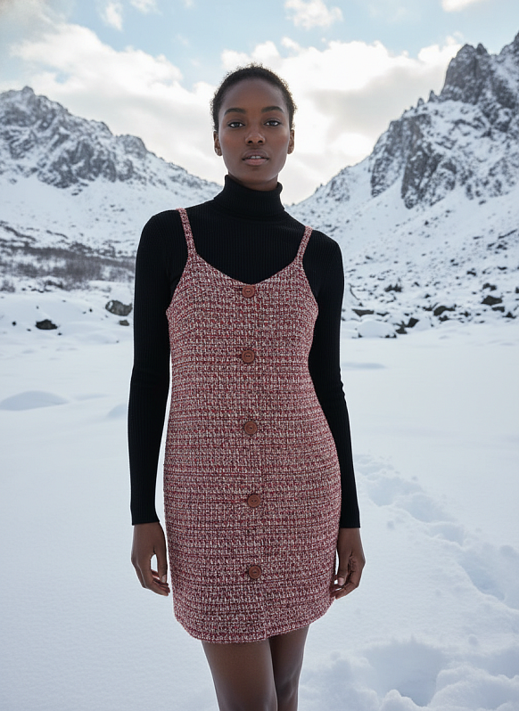 Сарафан прямого силуэта на подкладке. Модель на тонких бретелях с V-образным вырезом спереди и сзади. Центральная застёжка на пуговицы. Имеются карманы в боковых швах. В комплект к сарафану входит декоративный съемный пояс в тон ткани. Изделие выполнено из шерстяной твидовой ткани с фактурным орнаментом и вискозной подкладочной ткани, что обеспечивает комфорт и сохранность тепла.