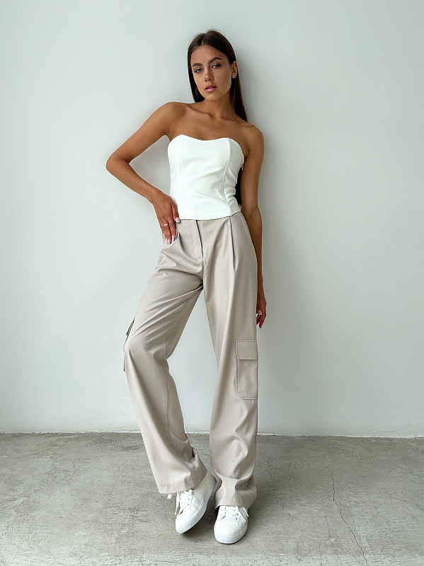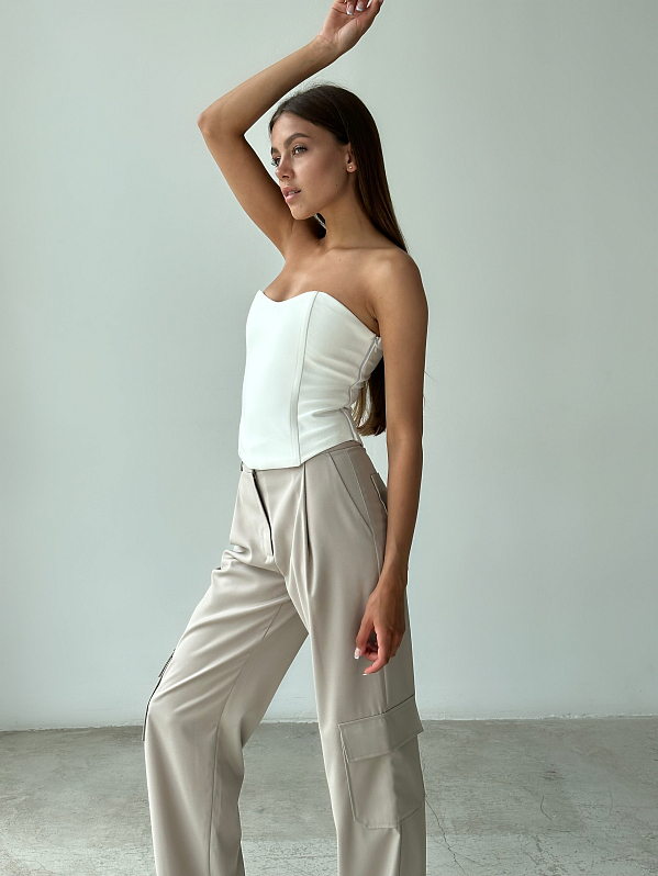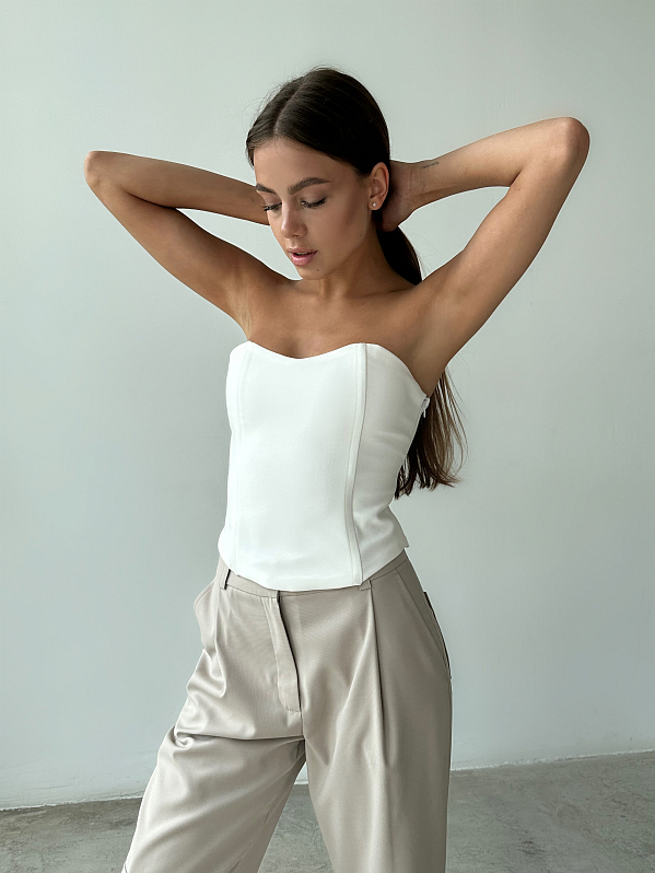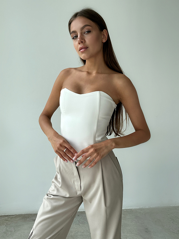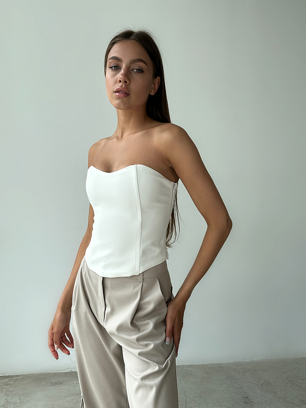 Топ-корсет на подкладке с фигурным лифом. Сбоку застёжка на потайную тесьму "молния".Корсетный тип изделия достигается за счет жестких элементов, вставленных в швы. Изделие выполнено из костюмной ткани верха и вискозной подкладочной ткани, что обеспечивает комфорт и удобство при носке.
