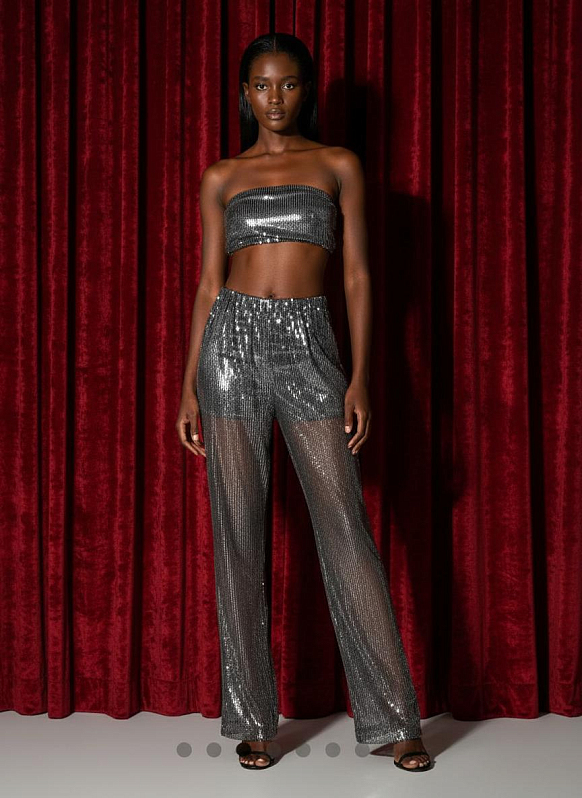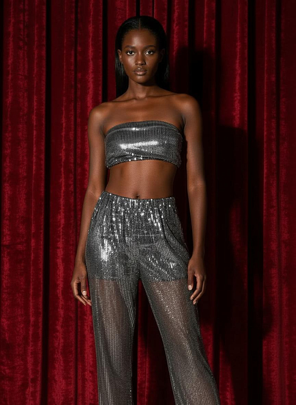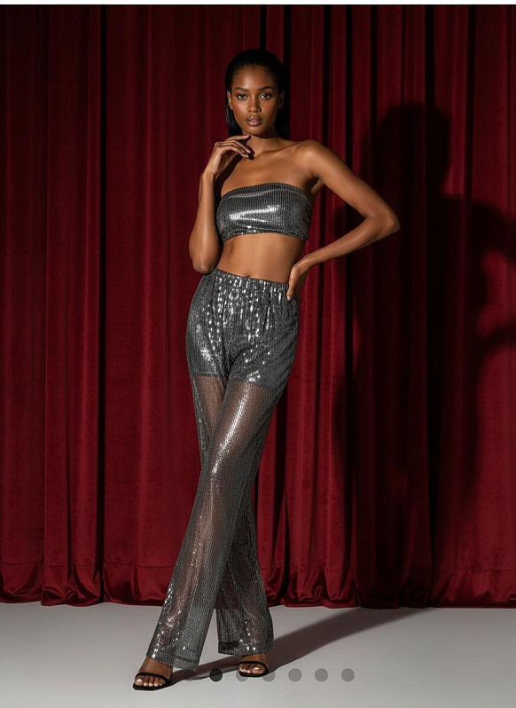 Укороченный топ прилегающего силуэта на подкладке. По спинке эластичная сборка, выполненная с помощью резиновой нити в несколько рядов. Изделие выполнено из капрона с пайетками и вискозной подкладочной ткани.