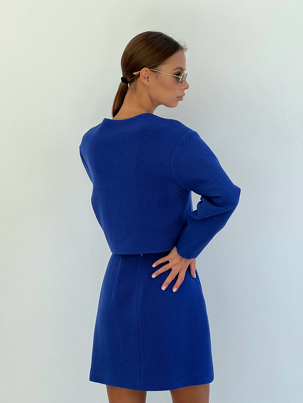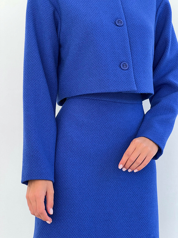 Юбка мини А-силуэта на подкладке, с притачным поясом. Сзади застежка на потайную тесьму "молния" и пуговицу. Изделие выполнено из твидовой ткани верха и вискозной подкладочной ткани, что обеспечивает комфорт и удобство при носке.