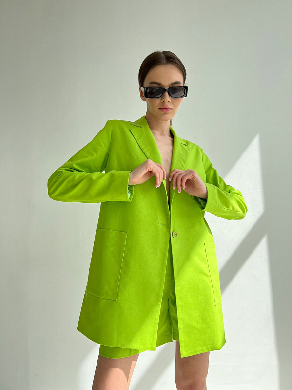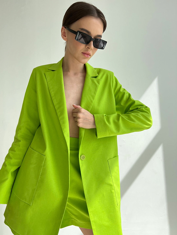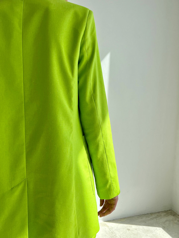 Жакет полуприлегающего силуэта на подкладке с английским воротником. Перед с накладными карманами. Спинка с вытачками и средним швом со шлицей снизу. Модель имеет длинный втачной рукав. Изделие выполнено из ткани с содержанием льна и приятной к телу подкладочной ткани.